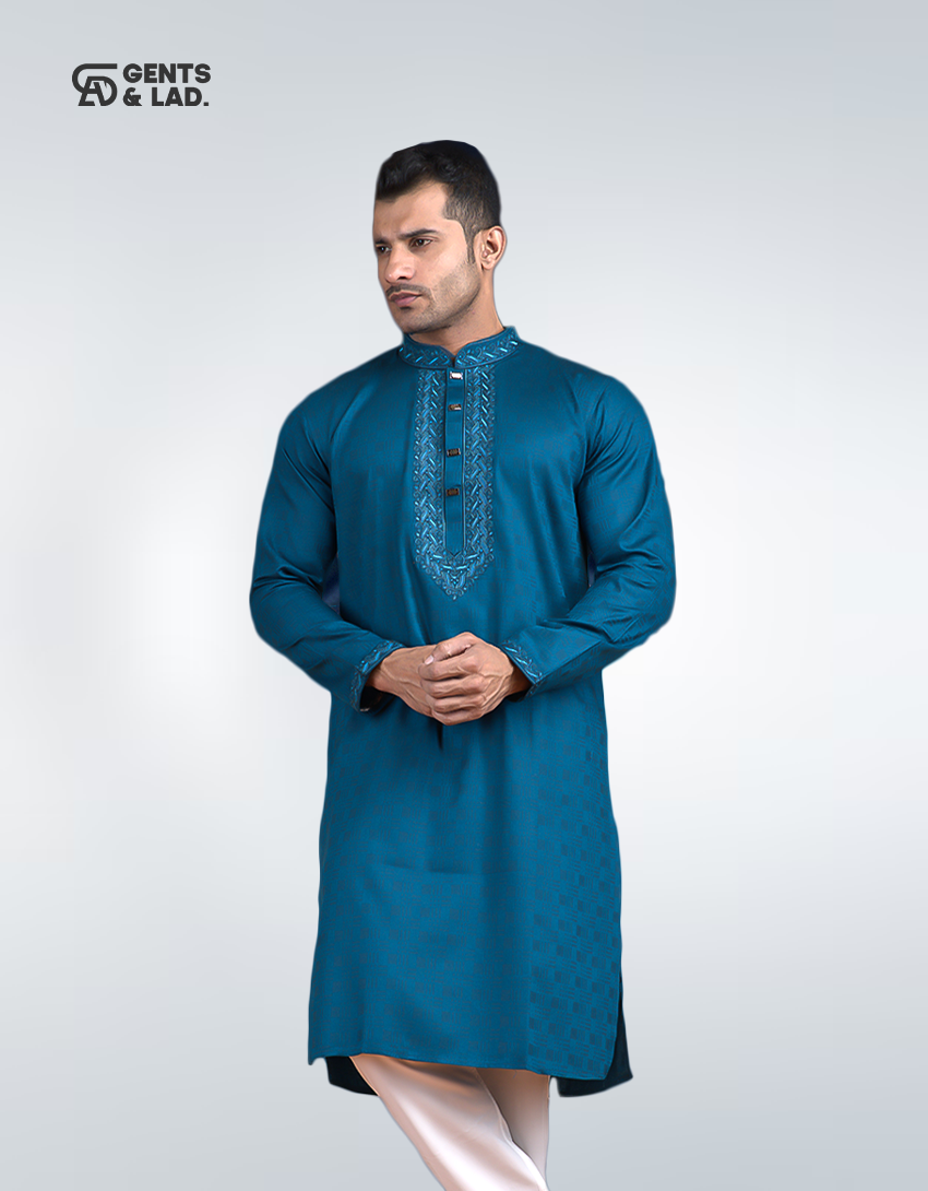 A cotton embroidery panjabi is a traditional, loose-fitting garment, typically made from soft, woven cotton and adorned with intricate embroidery designs, often featuring patterns stitched onto the fabric with thread.